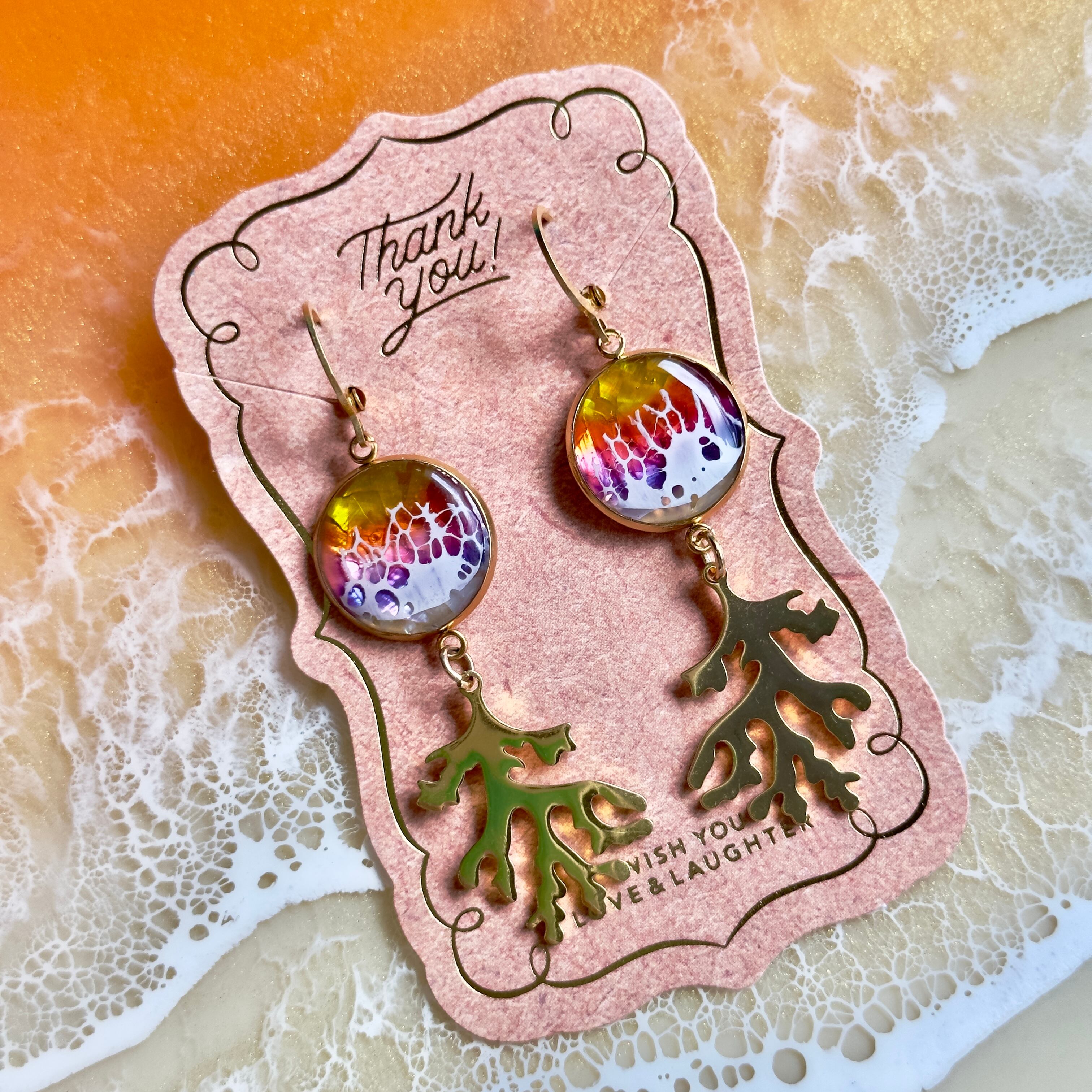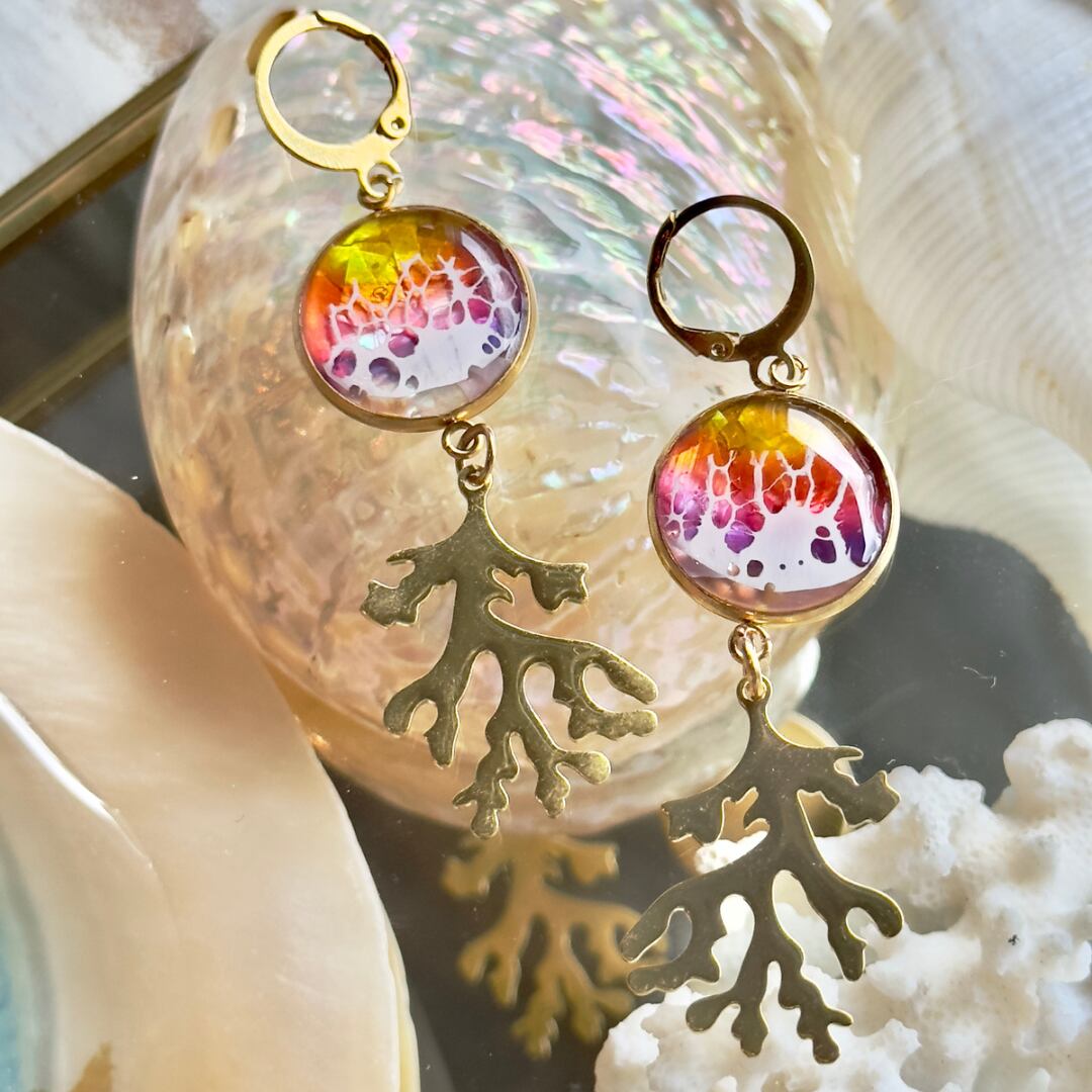 1.6cmの小さな海に広がる美しいグラデーションのsunset。海の底にはシェルの欠片が煌めきを放ち、ゴールドやシルバーの珊瑚が揺れ動くたびに上品に輝く「Ocean design pierce sunset ver」