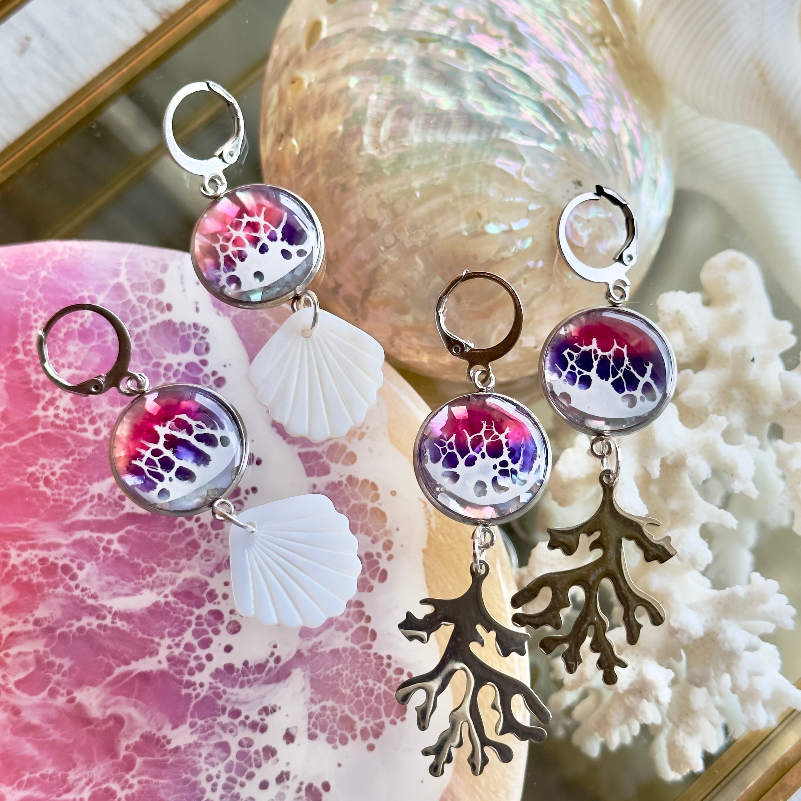 1.6cmの小さな海に広がる美しいグラデーションのピンクとパープルのsunset。海の底にはシェルの欠片が煌めきを放ち、ゴールドやシルバーの珊瑚が揺れ動くたびに上品に輝く「Ocean design pierce mermaid pink ver」